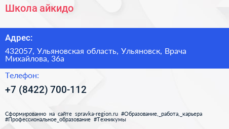 Школа айкидо по адресу 432057, Ульяновская область, Ульяновск, Врача Михайлова, 36а в дальнейшем Организация, размещена в следующих категориях: