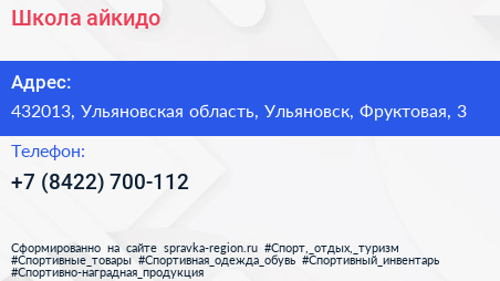 Школа айкидо по адресу 432013, Ульяновская область, Ульяновск, Фруктовая, 3 в дальнейшем Организация, размещена в следующих категориях: