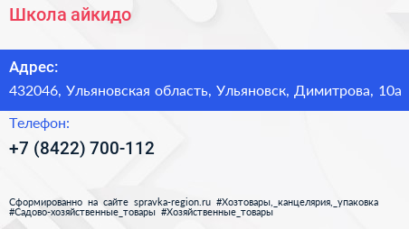 Школа айкидо по адресу 432046, Ульяновская область, Ульяновск, Димитрова, 10а в дальнейшем Организация, размещена в следующих категориях:
