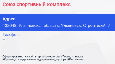 Союз, спортивный комплекс по адресу 432048, Ульяновская область, Ульяновск, Строителей, 7 в дальнейшем Организация, размещена в следующих категориях:
