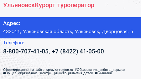 УльяновскКурорт, туроператор по адресу 432011, Ульяновская область, Ульяновск, Дворцовая, 5 в дальнейшем Организация, размещена в следующих категориях: