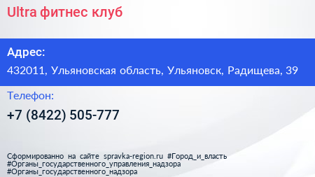 Ultra, фитнес-клуб по адресу 432011, Ульяновская область, Ульяновск, Радищева, 39 в дальнейшем Организация, размещена в следующих категориях: