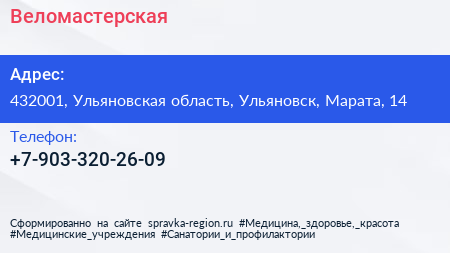 Веломастерская по адресу 432001, Ульяновская область, Ульяновск, Марата, 14 в дальнейшем Организация, размещена в следующих категориях:
