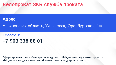 Велопрокат SKR, служба проката по адресу Ульяновская область, Ульяновск, Оренбургская, 1ж в дальнейшем Организация, размещена в следующих категориях: