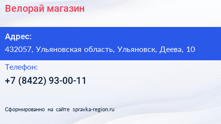 Велорай, магазин по адресу 432057, Ульяновская область, Ульяновск, Деева, 10 в дальнейшем Организация, размещена в следующих категориях: