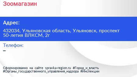 Зоомагазин по адресу 432034, Ульяновская область, Ульяновск, проспект 50-летия ВЛКСМ, 2г в дальнейшем Организация, размещена в следующих категориях: