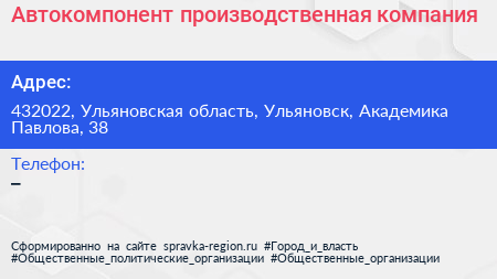 Автокомпонент, производственная компания по адресу 432022, Ульяновская область, Ульяновск, Академика Павлова, 38 в дальнейшем Организация, размещена в следующих категориях: