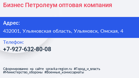 Бизнес Петролеум, оптовая компания по адресу 432001, Ульяновская область, Ульяновск, Омская, 4 в дальнейшем Организация, размещена в следующих категориях: