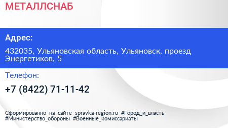 МЕТАЛЛСНАБ по адресу 432035, Ульяновская область, Ульяновск, проезд Энергетиков, 5 в дальнейшем Организация, размещена в следующих категориях: