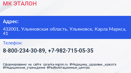 МК-ЭТАЛОН по адресу 432001, Ульяновская область, Ульяновск, Карла Маркса, 41 в дальнейшем Организация, размещена в следующих категориях: