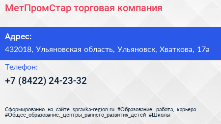 МетПромСтар, торговая компания по адресу 432018, Ульяновская область, Ульяновск, Хваткова, 17а в дальнейшем Организация, размещена в следующих категориях: