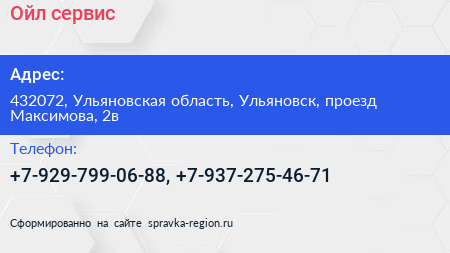 Ойл-сервис по адресу 432072, Ульяновская область, Ульяновск, проезд Максимова, 2в в дальнейшем Организация, размещена в следующих категориях: