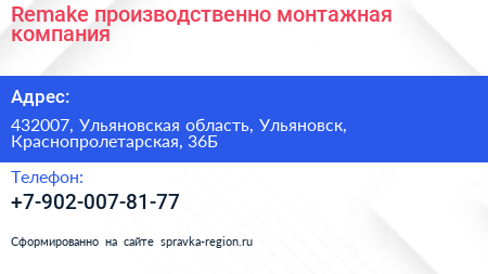 Remake, производственно-монтажная компания по адресу 432007, Ульяновская область, Ульяновск, Краснопролетарская, 36Б в дальнейшем Организация, размещена в следующих категориях:
