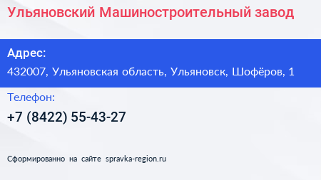 Ульяновский Машиностроительный завод по адресу 432007, Ульяновская область, Ульяновск, Шофёров, 1 в дальнейшем Организация, размещена в следующих категориях: