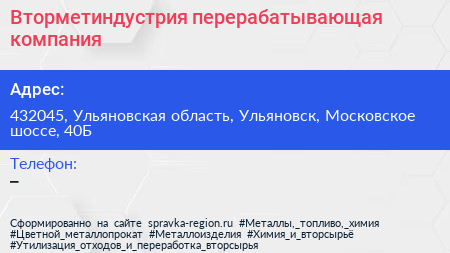 Вторметиндустрия, перерабатывающая компания по адресу 432045, Ульяновская область, Ульяновск, Московское шоссе, 40Б в дальнейшем Организация, размещена в следующих категориях: