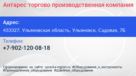 Антарес, торгово-производственная компания по адресу 433327, Ульяновская область, Ульяновск, Садовая, 7Б в дальнейшем Организация, размещена в следующих категориях: