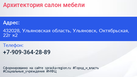 Архитектория, салон мебели по адресу 432028, Ульяновская область, Ульяновск, Октябрьская, 22г к2 в дальнейшем Организация, размещена в следующих категориях: