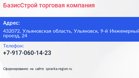 БазисСтрой, торговая компания по адресу 432072, Ульяновская область, Ульяновск, 9-й Инженерный проезд, 24 в дальнейшем Организация, размещена в следующих категориях: