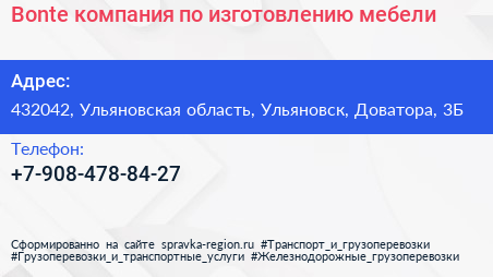 Bonte, компания по изготовлению мебели по адресу 432042, Ульяновская область, Ульяновск, Доватора, 3Б в дальнейшем Организация, размещена в следующих категориях:
