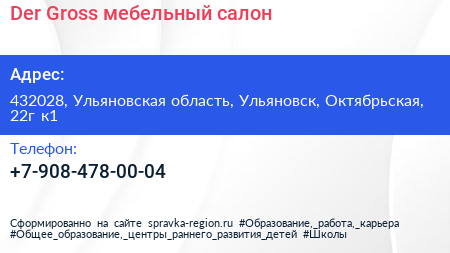 Der Gross, мебельный салон по адресу 432028, Ульяновская область, Ульяновск, Октябрьская, 22г к1 в дальнейшем Организация, размещена в следующих категориях:
