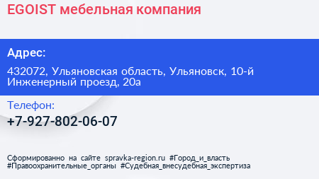 EGOIST, мебельная компания по адресу 432072, Ульяновская область, Ульяновск, 10-й Инженерный проезд, 20а в дальнейшем Организация, размещена в следующих категориях: