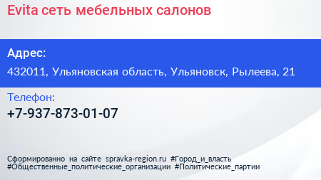 Evita, сеть мебельных салонов по адресу 432011, Ульяновская область, Ульяновск, Рылеева, 21 в дальнейшем Организация, размещена в следующих категориях: