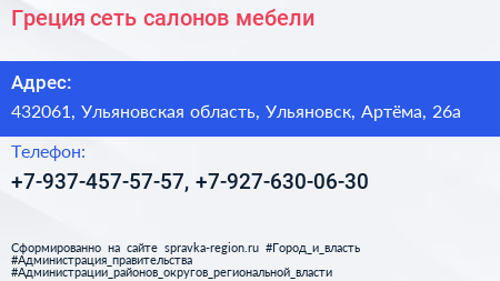 Греция, сеть салонов мебели по адресу 432061, Ульяновская область, Ульяновск, Артёма, 26а в дальнейшем Организация, размещена в следующих категориях: