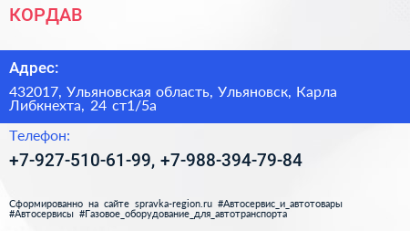 КОРДАВ по адресу 432017, Ульяновская область, Ульяновск, Карла Либкнехта, 24 ст1/5а в дальнейшем Организация, размещена в следующих категориях: