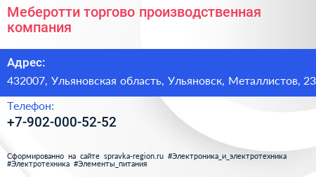Меберотти, торгово-производственная компания по адресу 432007, Ульяновская область, Ульяновск, Металлистов, 23 в дальнейшем Организация, размещена в следующих категориях: