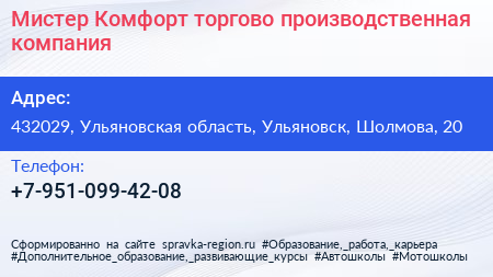 Мистер Комфорт, торгово-производственная компания по адресу 432029, Ульяновская область, Ульяновск, Шолмова, 20 в дальнейшем Организация, размещена в следующих категориях: