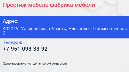 Престиж мебель, фабрика мебели по адресу 432045, Ульяновская область, Ульяновск, Промышленная, 2 в дальнейшем Организация, размещена в следующих категориях: