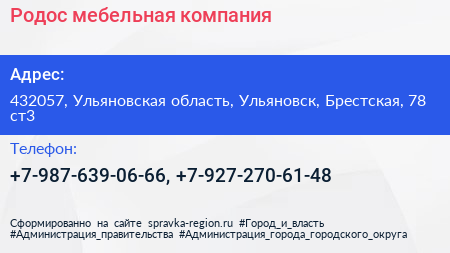 Родос, мебельная компания по адресу 432057, Ульяновская область, Ульяновск, Брестская, 78 ст3 в дальнейшем Организация, размещена в следующих категориях: