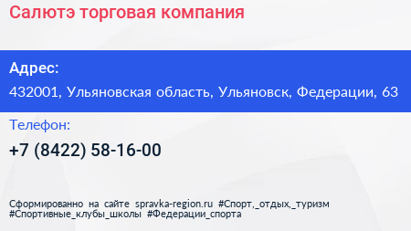 Салютэ, торговая компания по адресу 432001, Ульяновская область, Ульяновск, Федерации, 63 в дальнейшем Организация, размещена в следующих категориях: