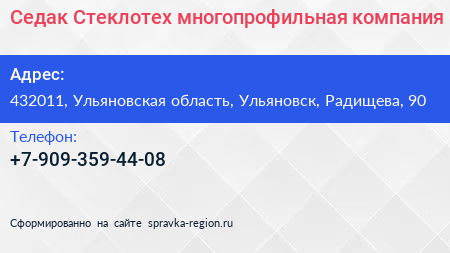 Седак-Стеклотех, многопрофильная компания по адресу 432011, Ульяновская область, Ульяновск, Радищева, 90 в дальнейшем Организация, размещена в следующих категориях: