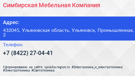 Симбирская Мебельная Компания по адресу 432045, Ульяновская область, Ульяновск, Промышленная, 2 в дальнейшем Организация, размещена в следующих категориях: