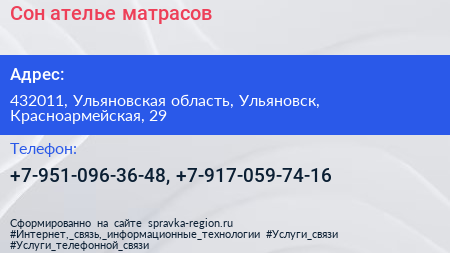 Сон, ателье матрасов по адресу 432011, Ульяновская область, Ульяновск, Красноармейская, 29 в дальнейшем Организация, размещена в следующих категориях: