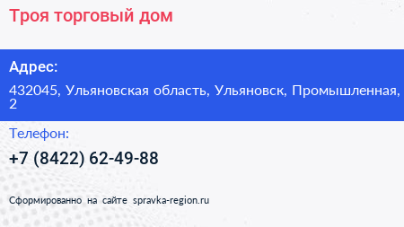 Троя, торговый дом по адресу 432045, Ульяновская область, Ульяновск, Промышленная, 2 в дальнейшем Организация, размещена в следующих категориях: