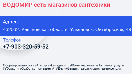 ВОДОМИР, сеть магазинов сантехники по адресу 432032, Ульяновская область, Ульяновск, Октябрьская, 48 в дальнейшем Организация, размещена в следующих категориях: