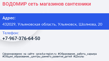 ВОДОМИР, сеть магазинов сантехники по адресу 432029, Ульяновская область, Ульяновск, Шолмова, 20 в дальнейшем Организация, размещена в следующих категориях: