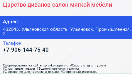 Царство диванов, салон мягкой мебели по адресу 432045, Ульяновская область, Ульяновск, Промышленная, 2 в дальнейшем Организация, размещена в следующих категориях: