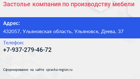 Застолье, компания по производству мебели по адресу 432057, Ульяновская область, Ульяновск, Деева, 37 в дальнейшем Организация, размещена в следующих категориях: