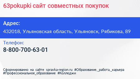 63pokupki, сайт совместных покупок по адресу 432018, Ульяновская область, Ульяновск, Рябикова, 89 в дальнейшем Организация, размещена в следующих категориях: