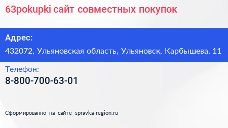 63pokupki, сайт совместных покупок по адресу 432072, Ульяновская область, Ульяновск, Карбышева, 11 в дальнейшем Организация, размещена в следующих категориях: