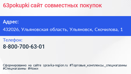 63pokupki, сайт совместных покупок по адресу 432026, Ульяновская область, Ульяновск, Скочилова, 1 в дальнейшем Организация, размещена в следующих категориях: