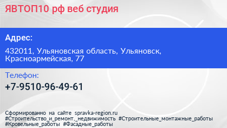 ЯВТОП10.рф, веб-студия по адресу 432011, Ульяновская область, Ульяновск, Красноармейская, 77 в дальнейшем Организация, размещена в следующих категориях: