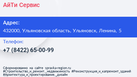 АйТи-Сервис по адресу 432000, Ульяновская область, Ульяновск, Ленина, 5 в дальнейшем Организация, размещена в следующих категориях: