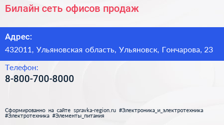 Билайн, сеть офисов продаж по адресу 432011, Ульяновская область, Ульяновск, Гончарова, 23 в дальнейшем Организация, размещена в следующих категориях: