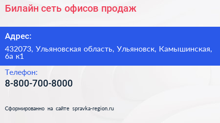 Билайн, сеть офисов продаж по адресу 432073, Ульяновская область, Ульяновск, Камышинская, 6а к1 в дальнейшем Организация, размещена в следующих категориях: