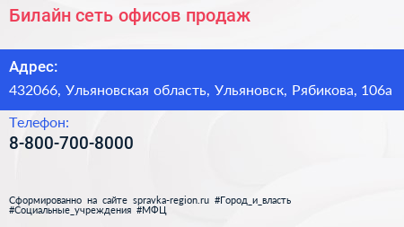 Билайн, сеть офисов продаж по адресу 432066, Ульяновская область, Ульяновск, Рябикова, 106а в дальнейшем Организация, размещена в следующих категориях: