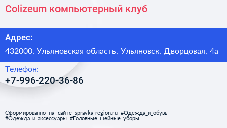 Colizeum, компьютерный клуб по адресу 432000, Ульяновская область, Ульяновск, Дворцовая, 4а в дальнейшем Организация, размещена в следующих категориях: